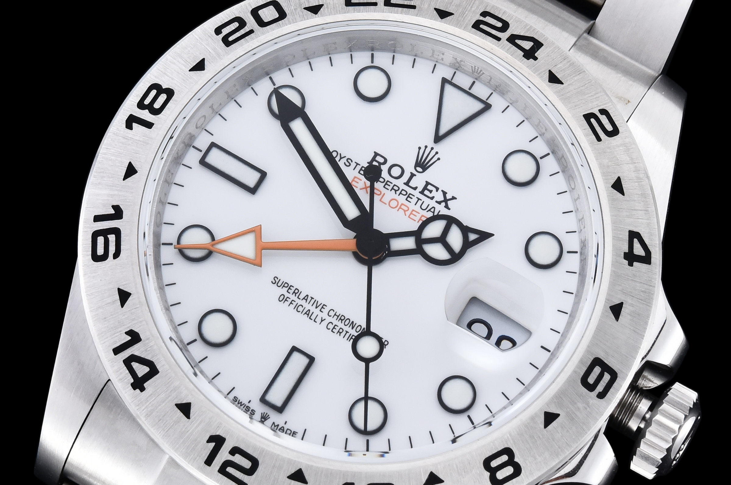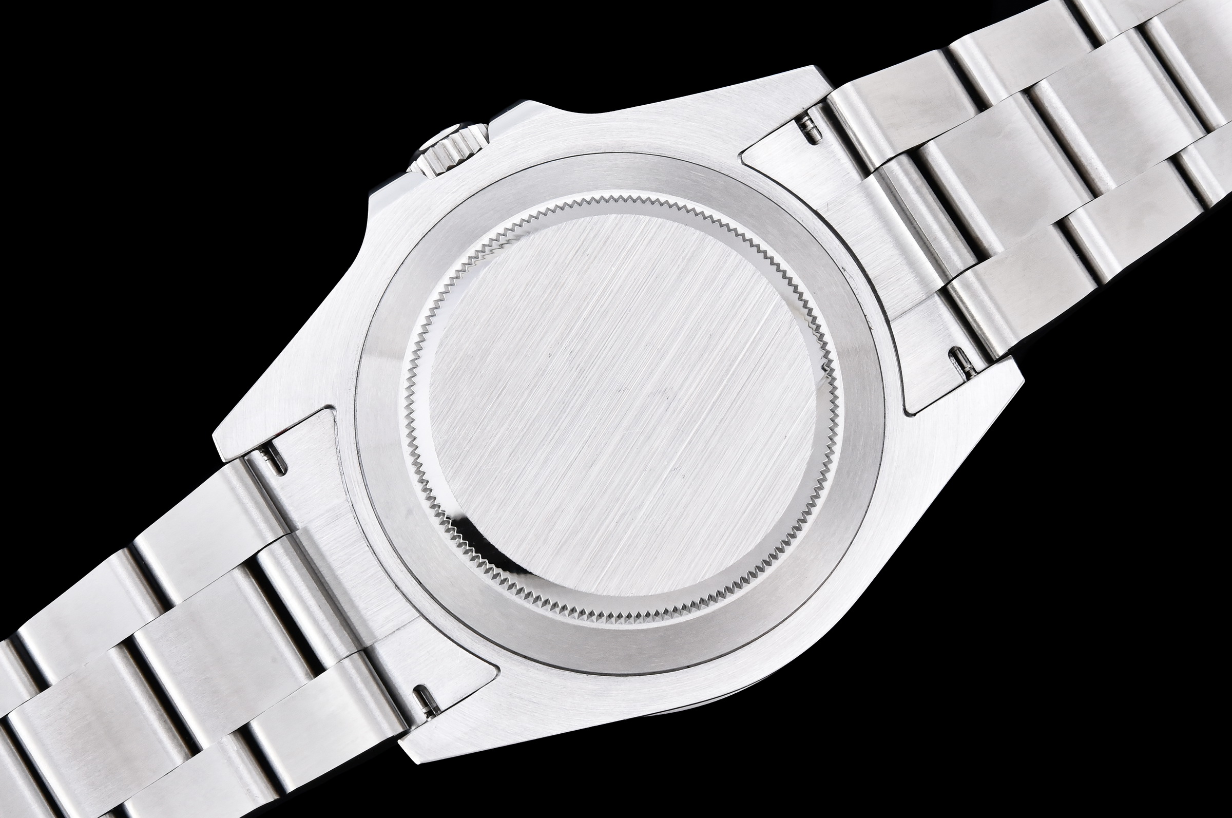 Bezel: 1:1 replicated solid 904L stainless steel brushed bezel with 24-hour markers