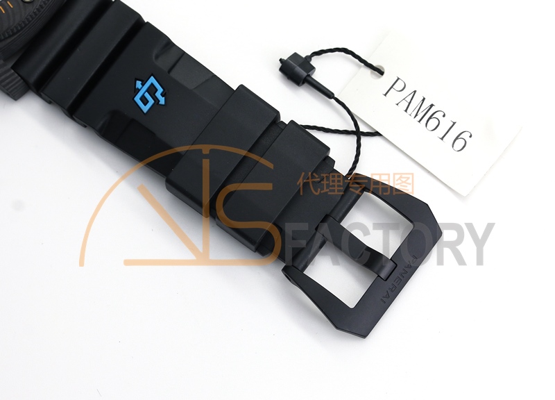 Strap: Black rubber strap with blue Panerai logo, same as genuine.